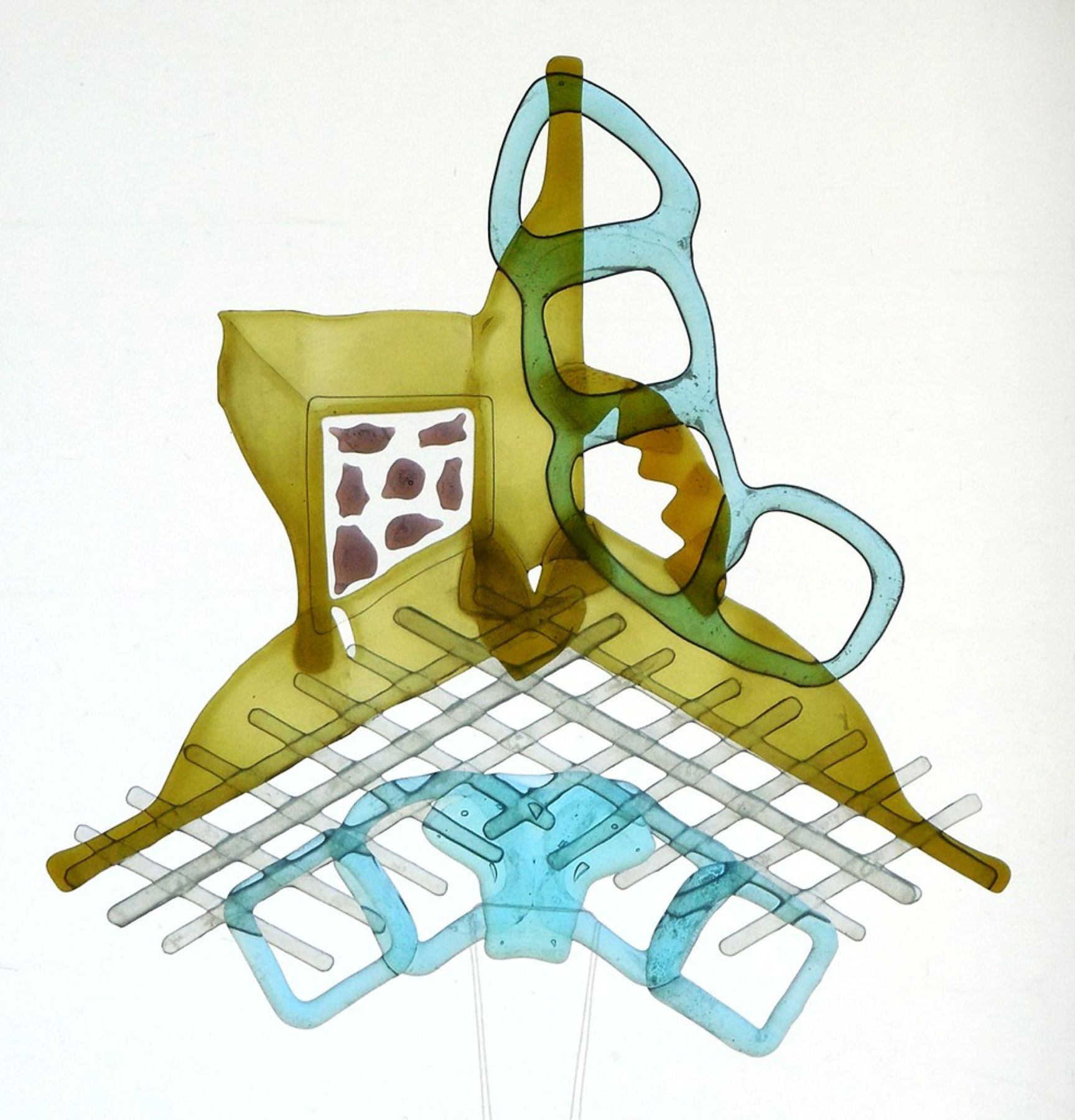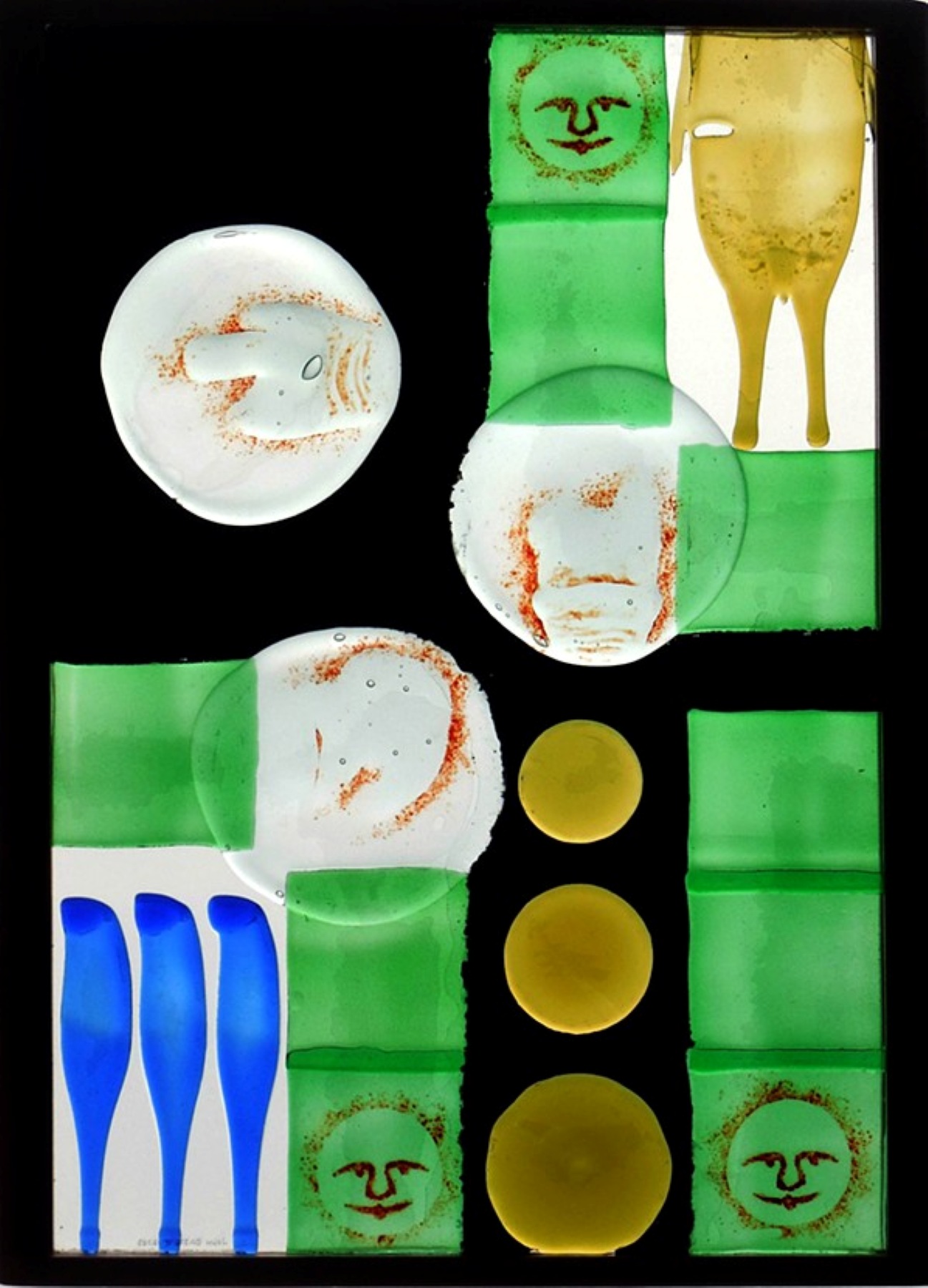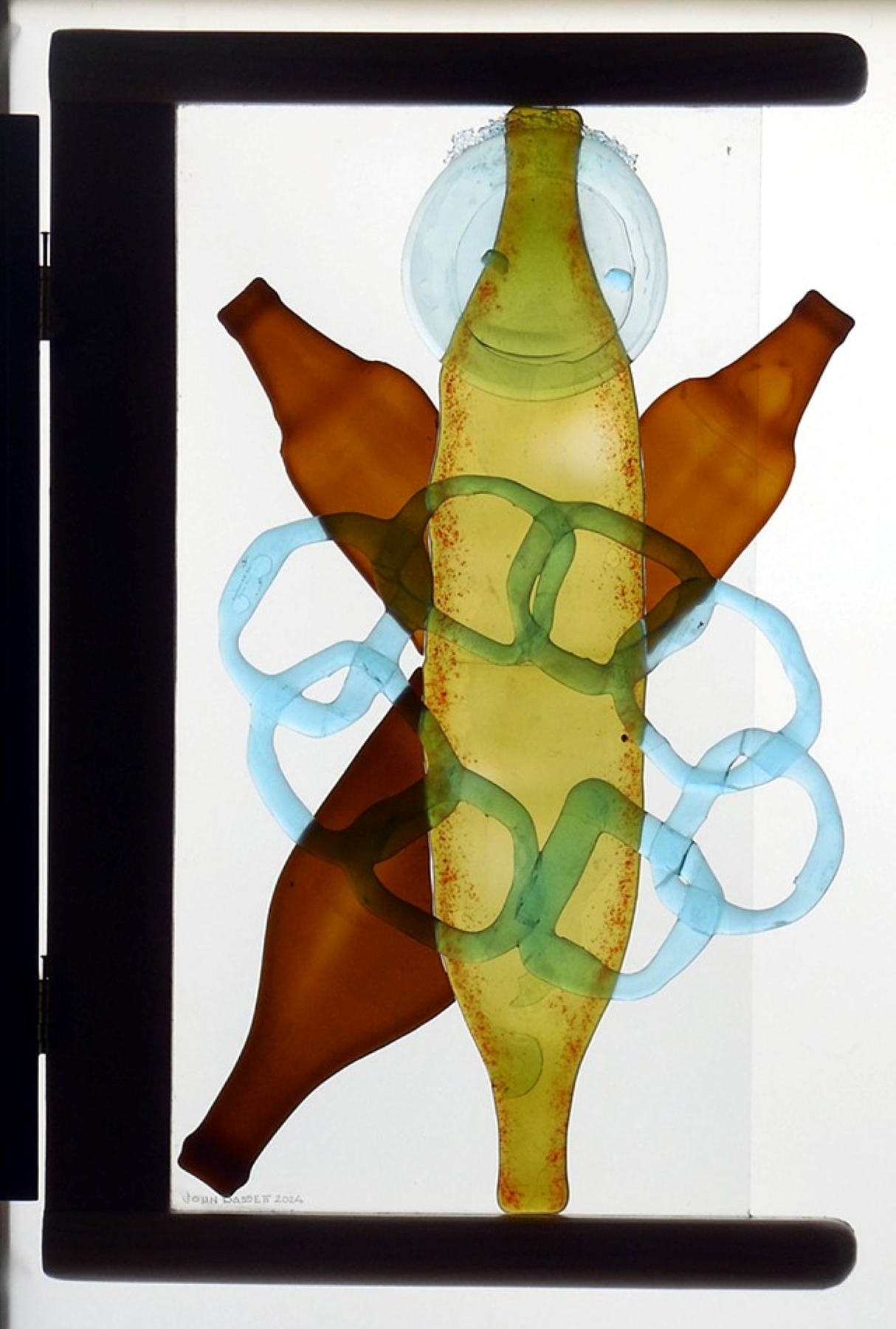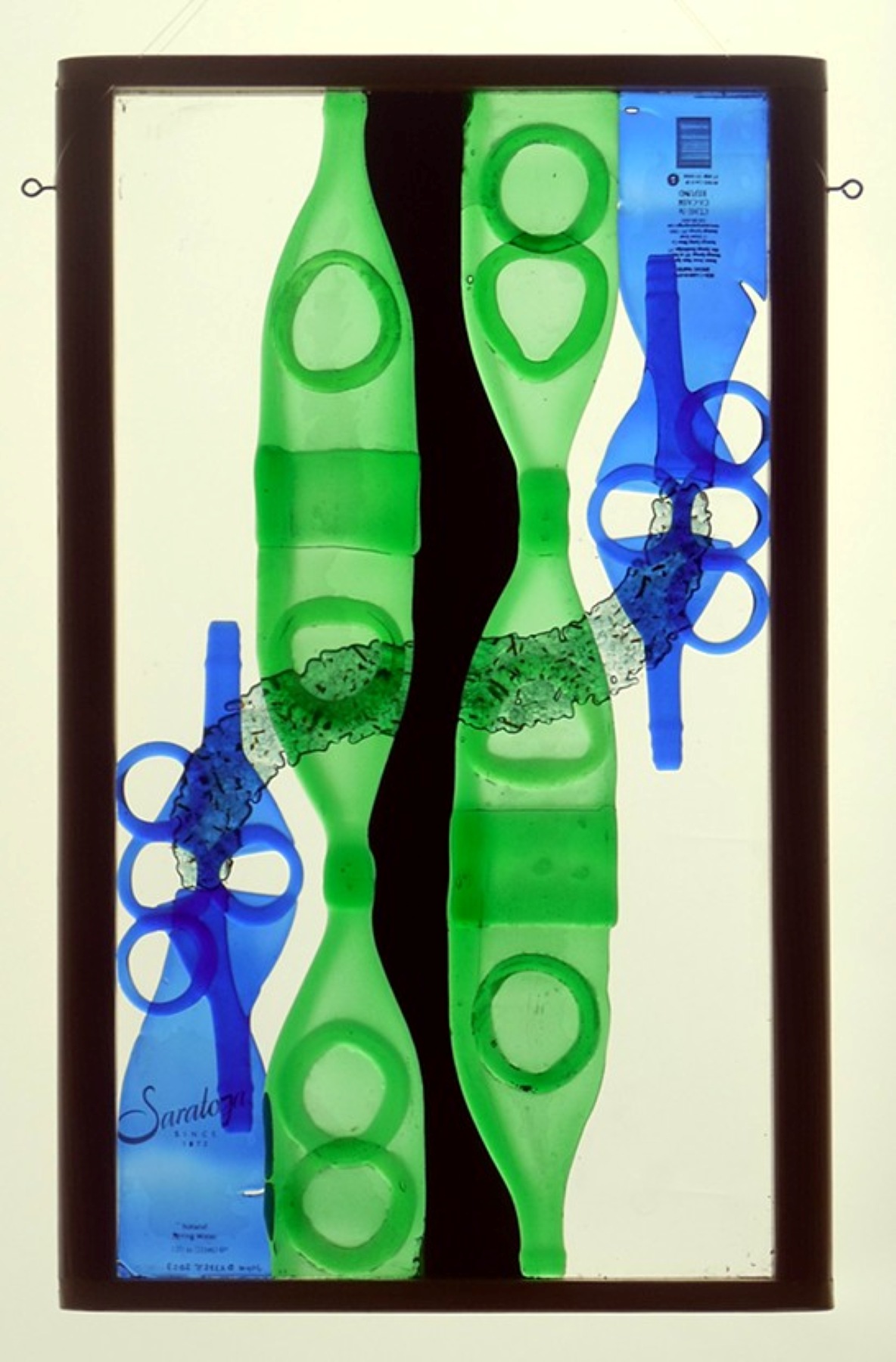I’m happy in the rich, associative world of recycled glass, especially bottles, and other found objects, and focused on that most conventional quality of glass, its transparency. Not flat, not round, my work might be called glass relief.