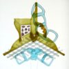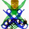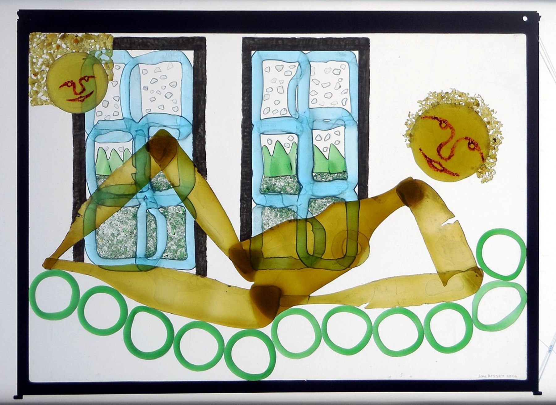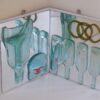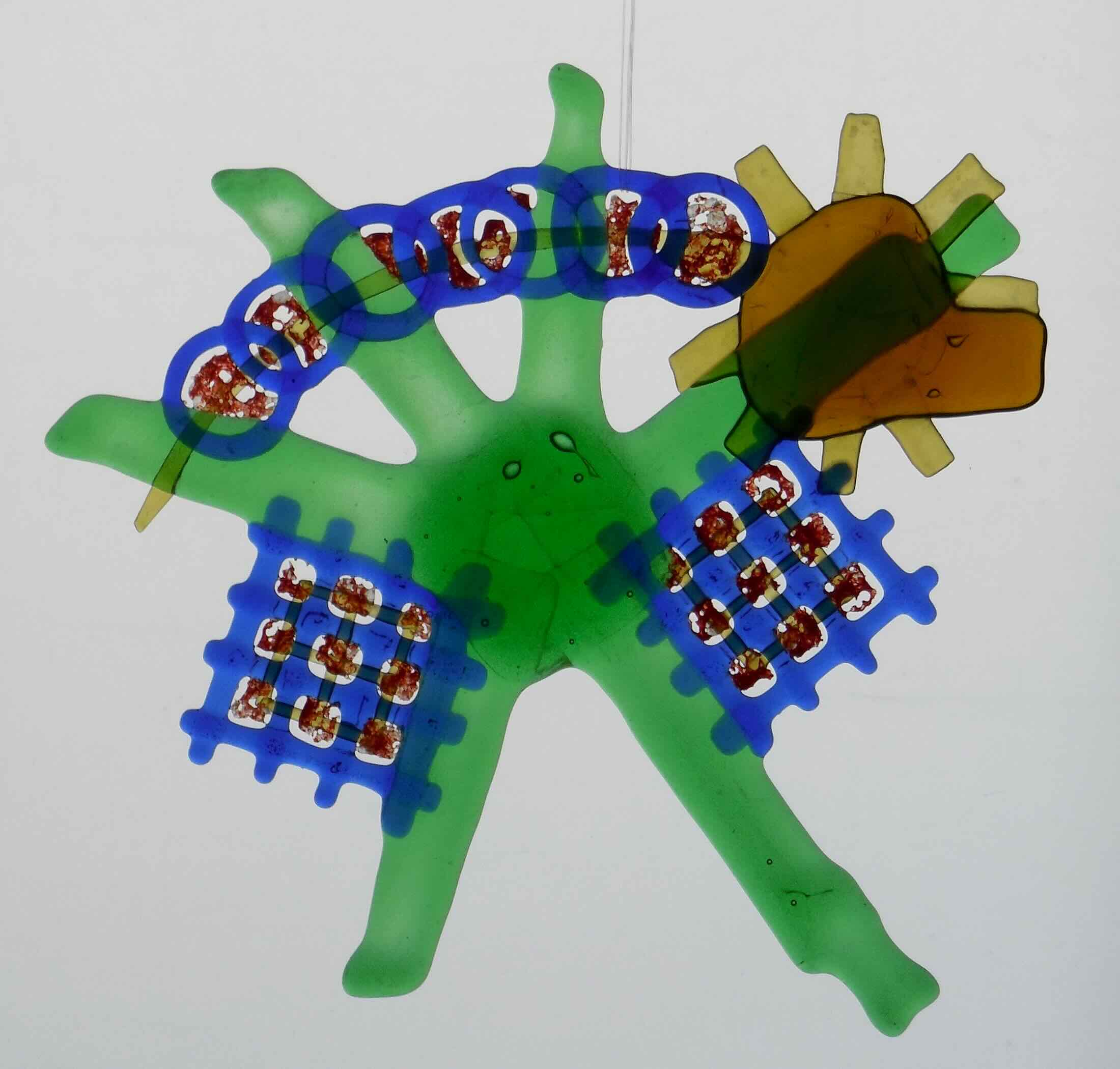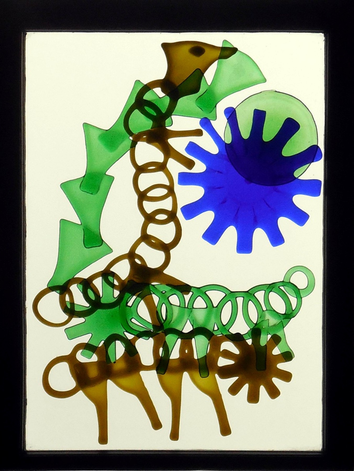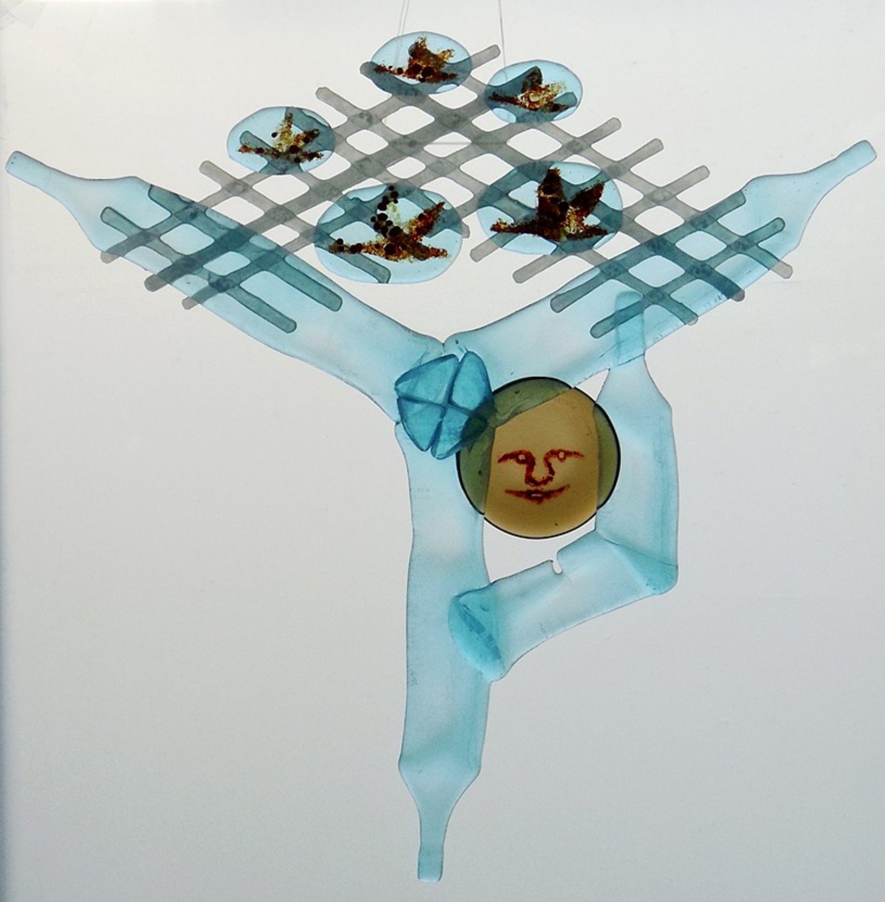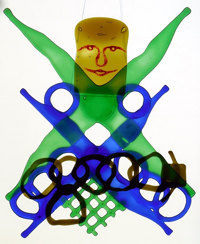 I like things that are funny. If my glass makes someone laugh, that’s good. I use recycled materials, including bottles, plates, wood windows, and construction scrap to make residential sized panels and commissions. I’m self taught in glass, but my uncle, Richard Bassett was an artist and encouraged me to paint and draw when I was young. A clever and generous man, Joseph LeBeau worked for my grandmother and made wonderful toy machines from scrap wood, recycled nails, and left over house paint. He gave these toy machines to any kid who wanted them. I think I learned from Joseph LeBeau the joy of making things, the possibility of using recycled, discarded materials, the possibility of making something from nothing, and the fun of sharing.