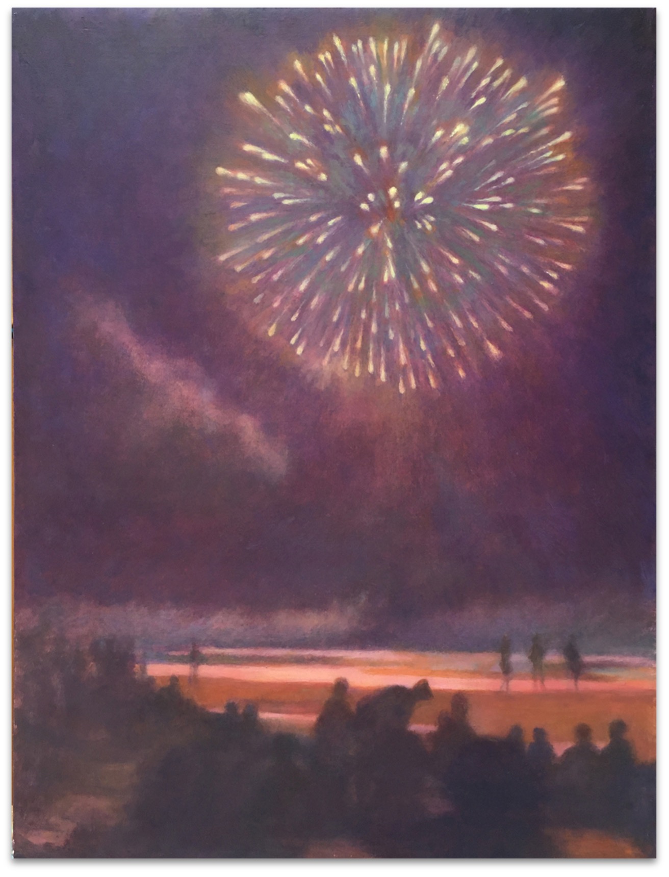 When thinking about the design it was important to organize the parts to emphasize the fireworks display, which is only a small area in the painting. About three quarters of the picture plane is subordinated to this center of interest. The figures in the foreground are held together as one mass that leads the eye inward then dissolves with a few isolated figures punctuating the middle ground—just far enough for the pink reflections and smoke clouds to take over the role in leading the eye toward the subject of the painting.