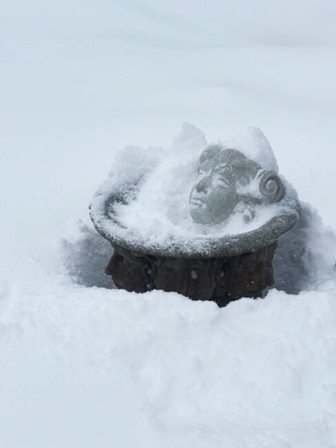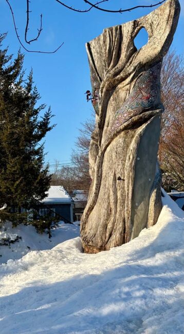 My original plan this winter was to start the mosaic on the new form I made for the tree in late fall. You can see it mounted on the tree on the right. I should have paid attention to my intuition that was telling me to bring the form up to the studio. I didn’t, and we are now buried in snow! But it will slowly melt, hopefully by the Spring!