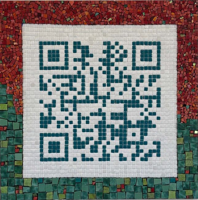Even though this winter has been a tough one with snow and cold, it is still going by fast! While snug and warm in my studio I signed up for an online class about making a QR code in mosaic, the goal being to have people walking by my property see what my studio is about and the kind of works I create. I plan to mount it to my sculpted tree. Even from a distance it works! The QR code directs people to my web site. Once the code is created you can do any type of work outside of the white border. I used both Italian and Mexican smalti in this work. If you would like to see it in person, go to the Rockport Art Association and Museum on Main street in Rockport and see the Spring Group show from March 28- May 6 or walk by my yard!